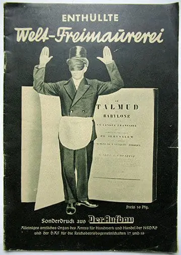 Die nationalsozialistische Hetzschrift ‚Enthüllte Welt-Freimaurerei‘, ca. 1935 veröffentlicht als Sonderdruck der NS-Zeitschrift ‚Der Aufbau‘, diffamierte die Freimaurerei und bereitete unsere Verfolgung im Dritten Reich propagandistisch auf. Autoritäre Systeme haben uns immer bekämpft. Wer solche Gegner hat, hat etwas richtiges im Sinn!